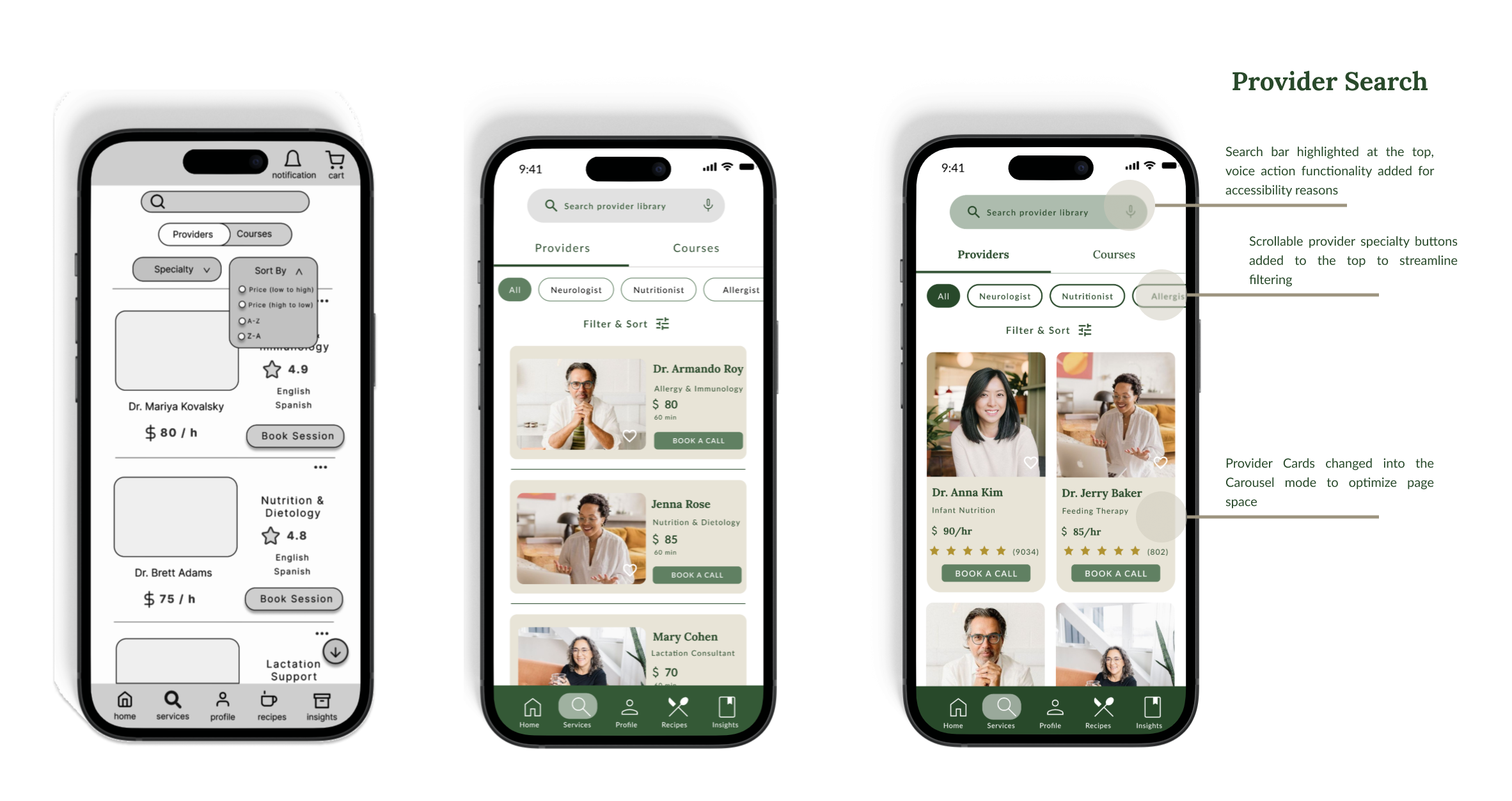 Upon conducting usability tests I decided to redesign some of the existing screens such as Provider Search & Profile, to decrease the cognitive load of prospective users and streamline the user journey. Please see some examples below: