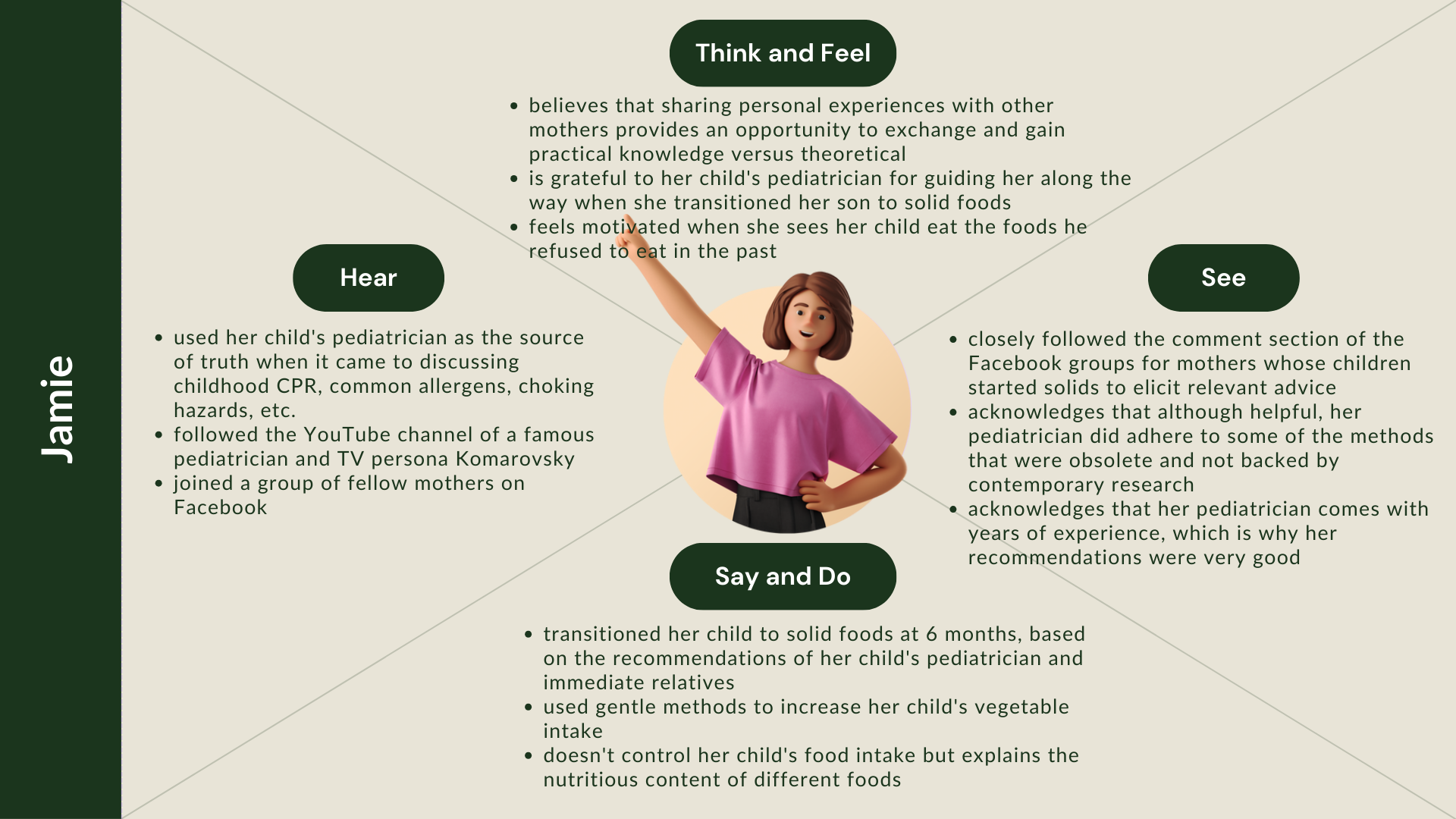 These interviews provided insights into parents' challenges, successes in navigating childhood nutrition, pain points in accessing educational resources, and experiences with professionals in this domain.